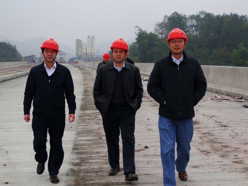 集團(tuán)公司朱堅(jiān)和董事長(zhǎng)(左一)、李定倫總經(jīng)理(右一)視察永寧河大橋施工現(xiàn)場(chǎng)