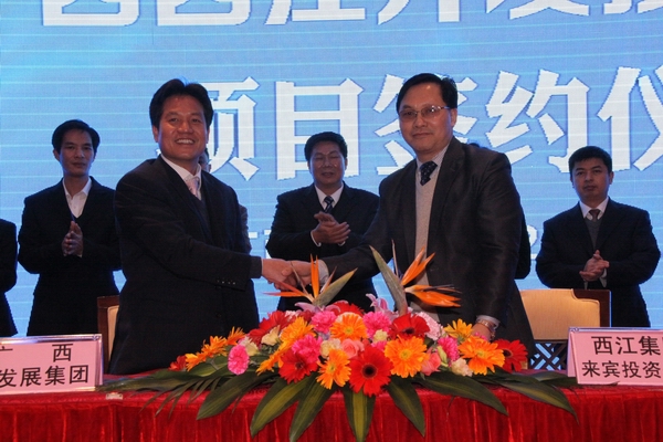 圖為:2月27日,圖為朱堅和董事長(左)與廣西西江開發(fā)投資集團代表簽署合作意向協(xié)議