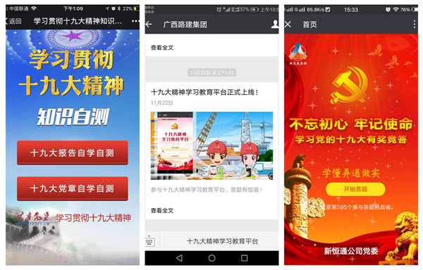而廣西路建集團、新恒通公司等直屬企業(yè)微信公眾號也開辟了十九大精神學習教育平臺,開創(chuàng)性地把知識性較強的黨建知識競答與趣味性十足的搶紅包結合到一起,寓教于樂,大大激發(fā)了廣大黨員干部和企業(yè)員工的學習積極性。