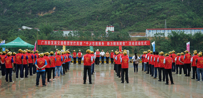 新恒通公司黨委書記、董事長(zhǎng)賴水平介紹,集團(tuán)公司所建設(shè)的賀州至巴馬、融水至河池高速公路是廣西縣縣通高速公路重點(diǎn)工程,沿線大部分縣區(qū)仍屬貧窮縣。為響應(yīng)中央精準(zhǔn)扶貧和建設(shè)美麗中國(guó)的號(hào)召,擔(dān)負(fù)起國(guó)企的社會(huì)責(zé)任,新恒通公司組織全線參建單位成立青年志愿者服務(wù)隊(duì),結(jié)合項(xiàng)目實(shí)際,從2018年1月至2020年12月在賀巴、融河等高速公路全線范圍內(nèi)開展為期三年的“千人志愿服務(wù),助力精準(zhǔn)脫貧”活動(dòng)。