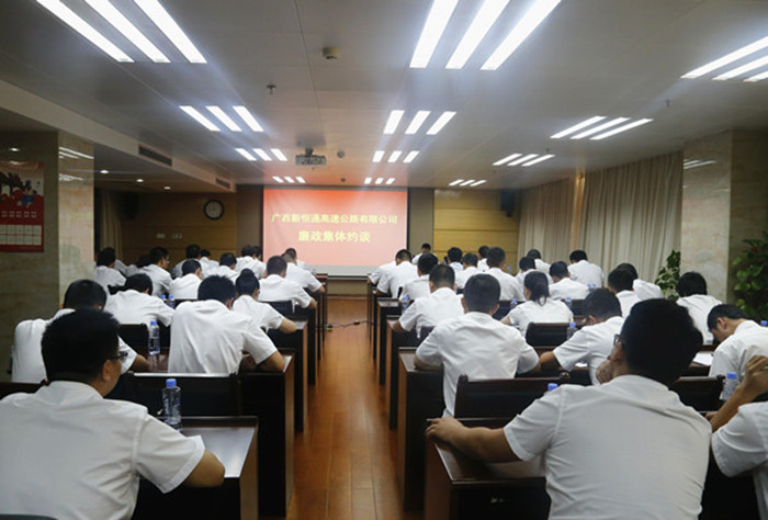 活動(dòng)上,新恒通公司黨委書(shū)記、董事長(zhǎng)賴(lài)水平還對(duì)與會(huì)人員進(jìn)行了廉政集體約談。賴(lài)水平感謝吳雄飛老師給大家上了一堂別開(kāi)生面的廉政警示教育課,作為交通基礎(chǔ)設(shè)施建設(shè)行業(yè)的業(yè)主單位,在廉潔從業(yè)的道路上,他提出幾點(diǎn)要求和期望:一是加強(qiáng)學(xué)習(xí),提升道德修養(yǎng),堅(jiān)定理想信念;二是嚴(yán)于律己,規(guī)范作風(fēng)行為,筑牢防腐堤壩;三是嚴(yán)以用權(quán),增強(qiáng)廉政意識(shí),緊守從業(yè)底線;四是守土有責(zé),堅(jiān)持“一崗雙責(zé)”,深化責(zé)任落實(shí)。賴(lài)水平強(qiáng)調(diào),廣西交通基礎(chǔ)設(shè)施建設(shè)正處于大有可為、大有作為的歷史機(jī)遇期,面對(duì)紛繁復(fù)雜的形勢(shì),全體黨員干部要在黨的十九大精神的指引下,緊緊圍繞公司總體工作思路和目標(biāo),統(tǒng)一思想,堅(jiān)定信念,持續(xù)加強(qiáng)作風(fēng)建設(shè),堅(jiān)決把紀(jì)律挺在前面,耳邊常響廉潔警鐘,心中常筑反腐防線,用廉潔從業(yè)的實(shí)際行動(dòng)為公司“縣縣通”高速公路建設(shè)事業(yè)的發(fā)展保駕護(hù)航。