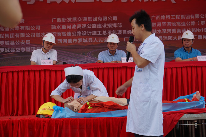 當(dāng)天的演練現(xiàn)場(chǎng)模擬情景為:2019年6月20日,在羅城縣四把鎮(zhèn)沖灣屯附近,融河高速公路K54+100高邊坡處現(xiàn)場(chǎng)4名邊坡防護(hù)作業(yè)人員正在緊張的施工,由于連續(xù)雨天上邊坡坡頂土體部分突然滑落,繼而出現(xiàn)大的滑坡裂縫,隨之大面積土石體坍塌,1名施工人員被垮塌的土石壓埋。事故發(fā)生后,參與演練人員及時(shí)報(bào)告和啟動(dòng)應(yīng)急預(yù)案,在坍塌現(xiàn)場(chǎng)設(shè)置臨時(shí)指揮部,指揮現(xiàn)場(chǎng)救援,將傷者抬出被困位置后,在演練會(huì)場(chǎng)進(jìn)行現(xiàn)場(chǎng)醫(yī)療和急救演示,再由救護(hù)車送到羅城縣人民醫(yī)院進(jìn)一步治療。