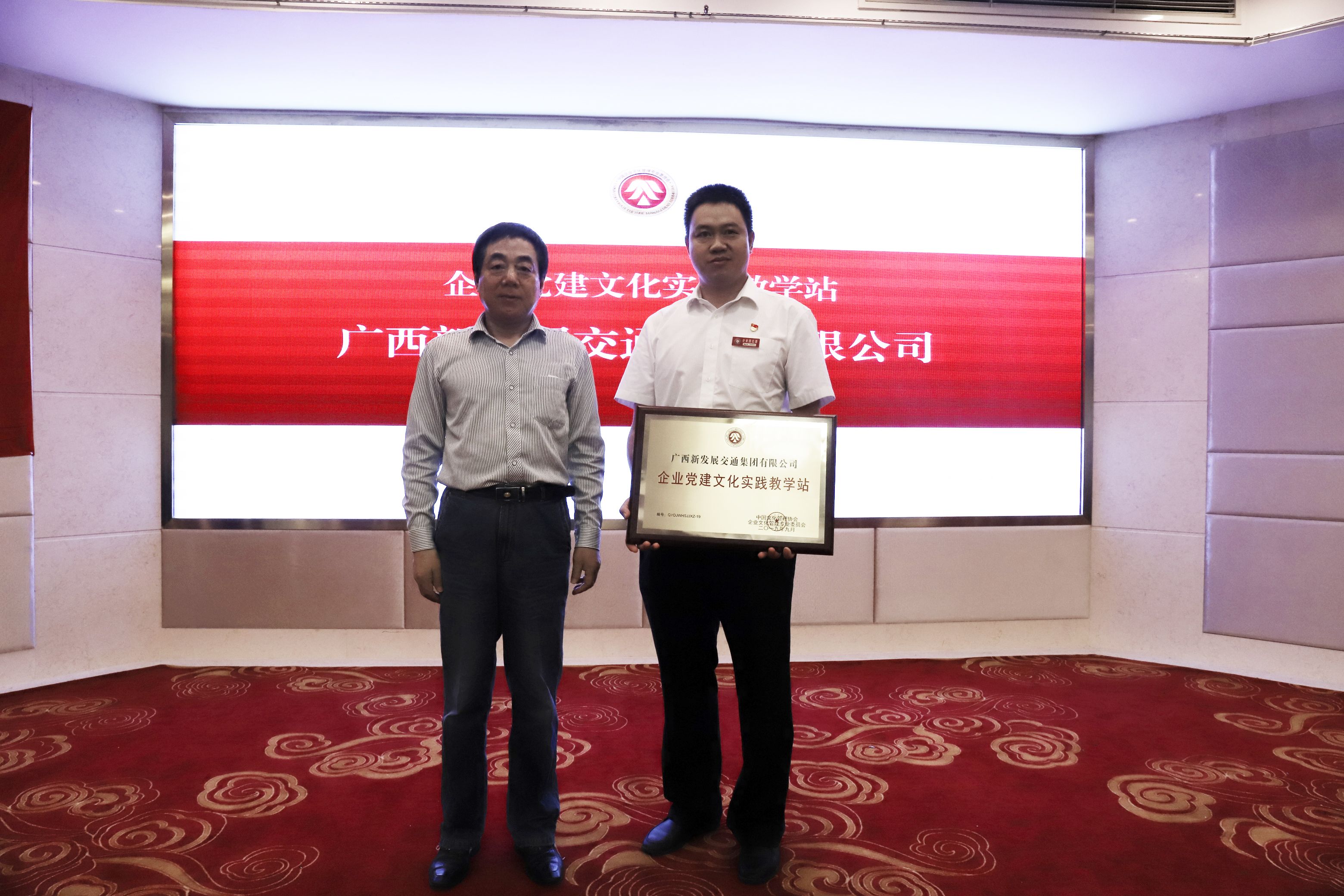 圖2:今年9月,黨建網執(zhí)行副總裁張國樑(左)為我公司頒發(fā)“企業(yè)黨建文化實踐教學站”牌匾。公司黨委書記、董事長賴水平(右)代表公司領獎