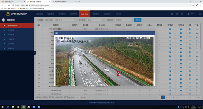 近日,昭平運營管理中心智慧高速軟件平臺引入了“人工智能事件檢測報警系統(tǒng)”。該系統(tǒng)采用了人工智能深度學習技術,在鐘昭高速每2公里一個監(jiān)控攝像機的硬件基礎上,能夠實現(xiàn)鐘昭高速全線事件檢測全面覆蓋,快速發(fā)現(xiàn)路上異常情況并發(fā)出警報。